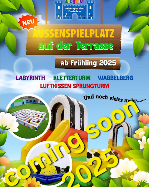 Wir freuen uns, euch ab Frühling 2025 ein brandneues Highlight präsentieren zu können: Unsere über 600m² grosse Terrasse mit coolen Hüpfburgen wartet darauf, von Gross und Klein erobert zu werden! Mitten im schönen Einsiedeln gelegen, bietet unser neuer Aussenbereich eine perfekte Kombination aus Abenteuer und Entspannung, ideal für Familien und Freunde, die einen unvergesslichen Tag erleben möchten.