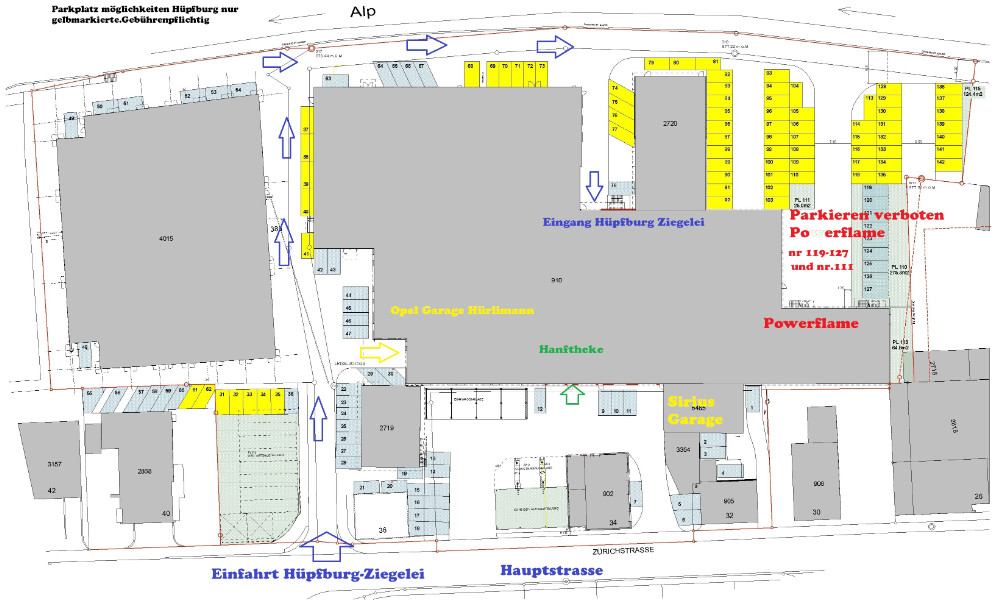 Auf dem Gelände der Ziegelei (ehemals Recyclinghof Steinauer) stehen über 70 Parkplätze zur Verfügung. Bitte nutzen Sie die gelb markierten Parkplätze – diese sind gebührenpflichtig.
